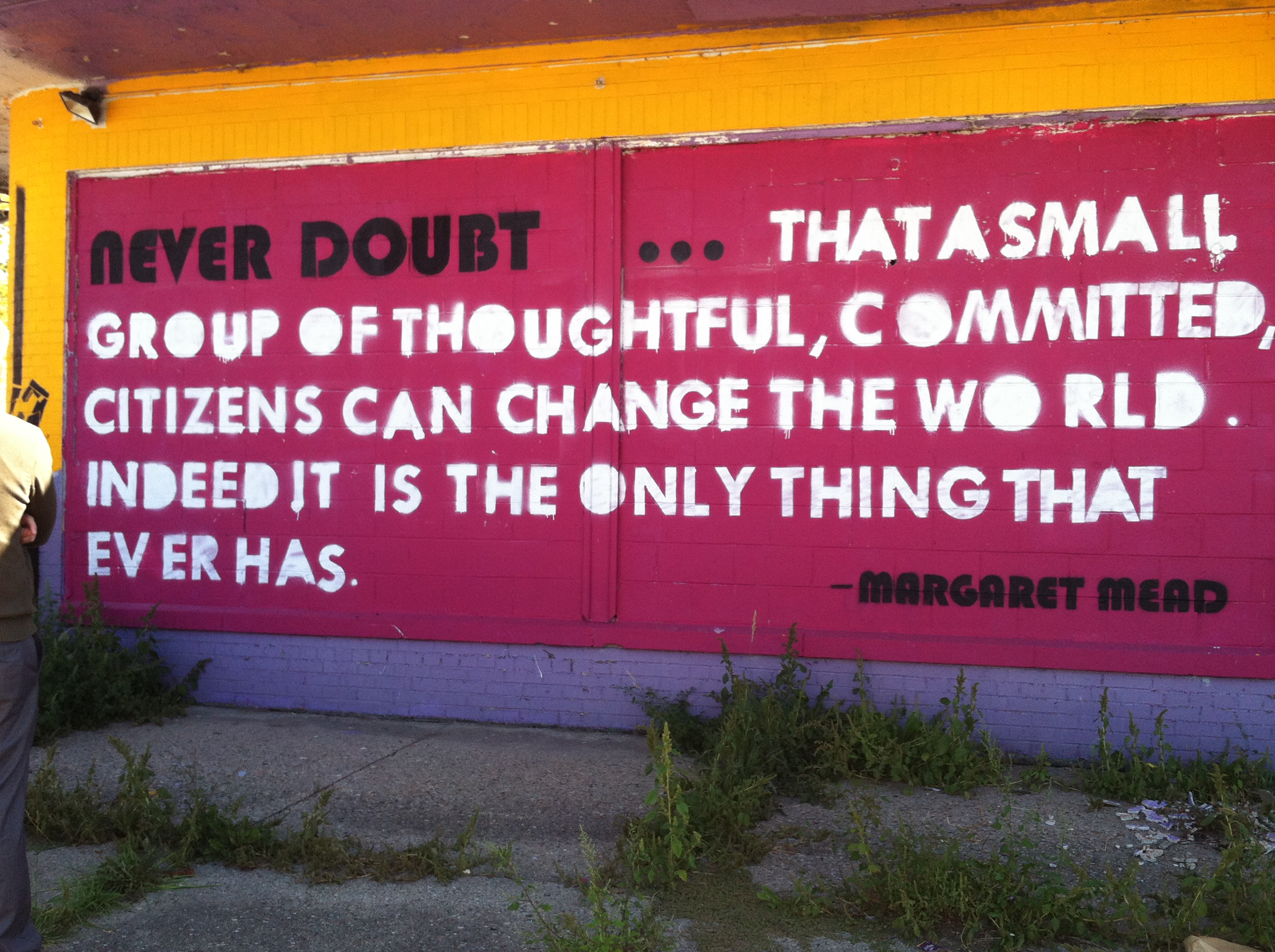 In one of the neighborhoods we visited, there is some street art that stuck with me. It said, “Never doubt… that a small group of thoughtful, committed citizens can change the world. Indeed it is the only thing that ever has.” Are you looking to be inspired? Are you looking to use your talents where they’re most needed and will be the most appreciated? If so, Detroit is the place to be!