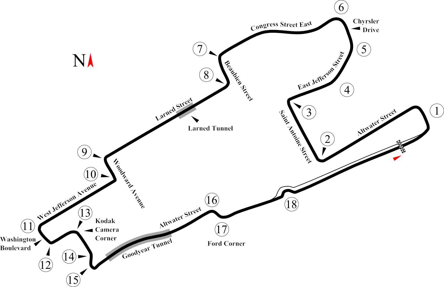 Detroit’s first Grand Prix race, held in 1982, was a 2.5 mile street circuit. The course ran through Detroit’s downtown, along the riverfront, and pass the Renaissance Center the headquarters to General Motors. The track became for it’s harsh conditions, including a train track crossing, bumpy track, and 17 hairpin turns.