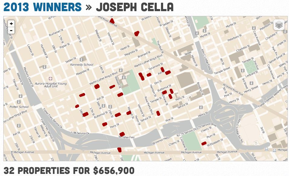 Here’s a case study – Joseph Cella, the founder and principal of “The Pontifex Group”, recently purchased 32 properties, totaling over $650,000 last Monday. His firm is a “boutique consulting firm that provides strategic and tactical consulting to corporations, high net-worth individuals, associations, non-profits, elected officials and candidates.” While a few of these properties were vacant land or “salvageable” houses, many were burnt out shells or completely scrapped and void of metal objects. His bidding pattern looks very algorithmic, almost as if he drew a circle around downtown and haphazardly bid on anything and everything within it. He chose not to wait until the second round, one month later, in which minimum bids are dropped to a paltry $500.