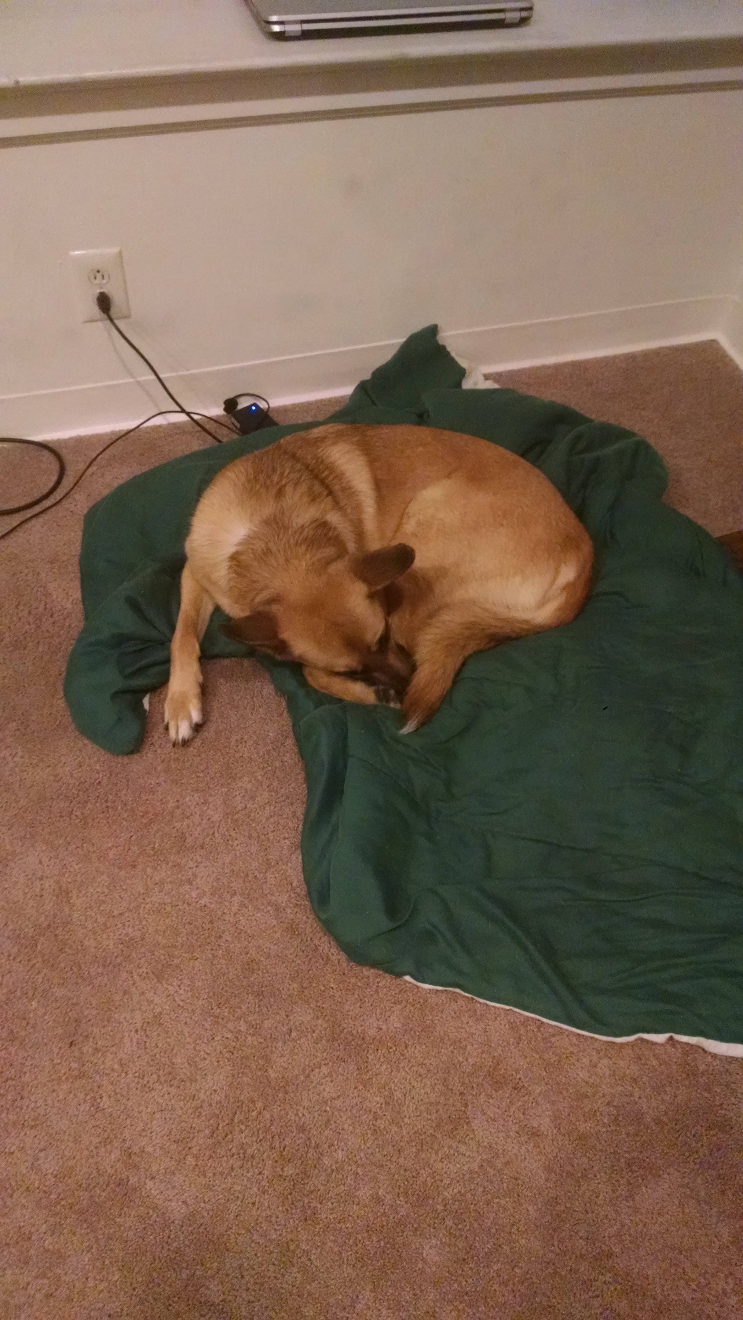 At the end of the day, I can usually find April curled up in the corner tired from the days activities. Don’t let that fool you though, she’s always up for playing as soon as you grab one of her toys. We have just enough space in our place for her to run around a little bit.