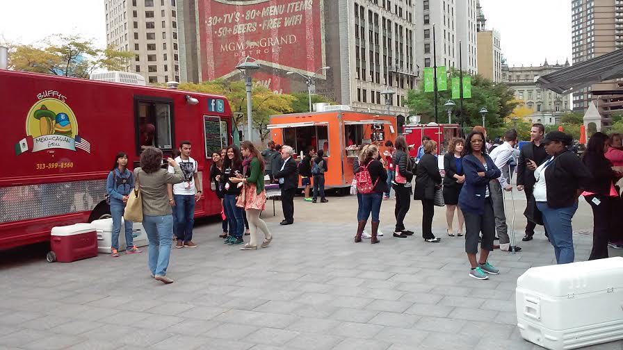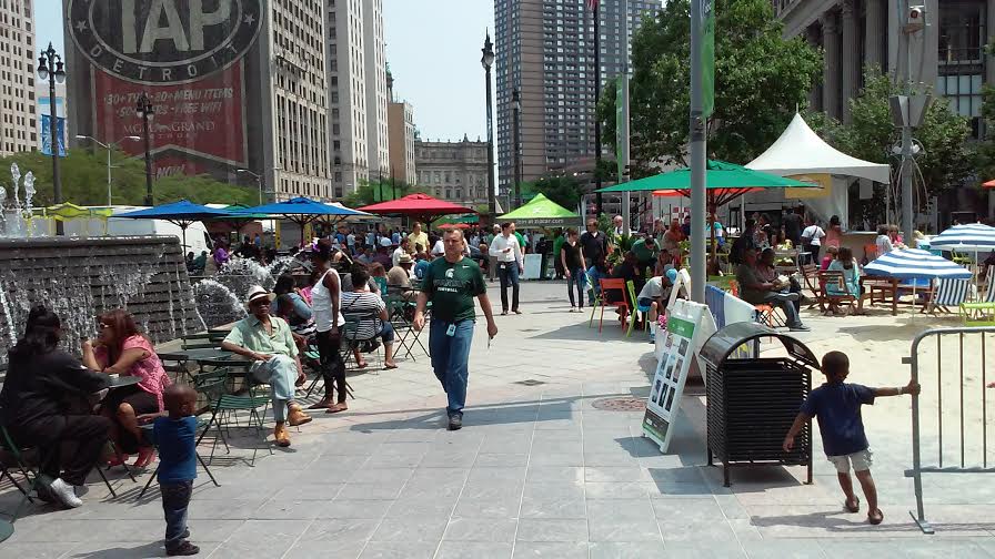 My affection for Detroit grew stronger as I experienced my first lunch on Campus Martius. According to its website, historic Campus Martius Park “anchors a two square block district that is the commercial center and heart of downtown Detroit…All of the major avenues radiate out from Detroit’s Point of Origin in the Park” (thanks to two DXF tours, I can tell you many more fun facts about Campus Martius – so please ask). During the summer and spring months, Campus Martius is transformed with an amazing array of available activities that seem tailor-made for me.