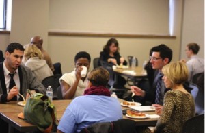 Challenge Detroit Fellows Ali Beydoun and Jason Zogg discuss enrollment topics with forum attendees over lunch at Enroll Detroit.