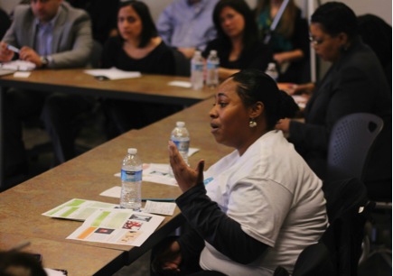 Challenge Detroit Fellows Jackie Smith and Sarah Grieb lead an interactive dialogue to get attendees’ input and feedback on one of the proposed ideas around information accessibility and enrollment.