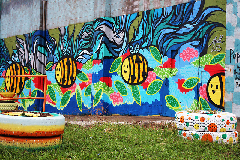 The concert engaged all the senses as attendees gazed at vivid works of art that covered the space’s interior framework. This recycling center is unlike any other. The 30-foot walls serve as enormous canvases suited for artistic expression. Outside, numerous three-dimensional sculptures and murals create the Lincoln Street Art Park. Even the street canvased an artistic presence. In fact, one of the murals in the train overpass was created with the help of Challenge Detroit Program Director Shelley Danner during a Van Dusen workshop with Little Things Labs.