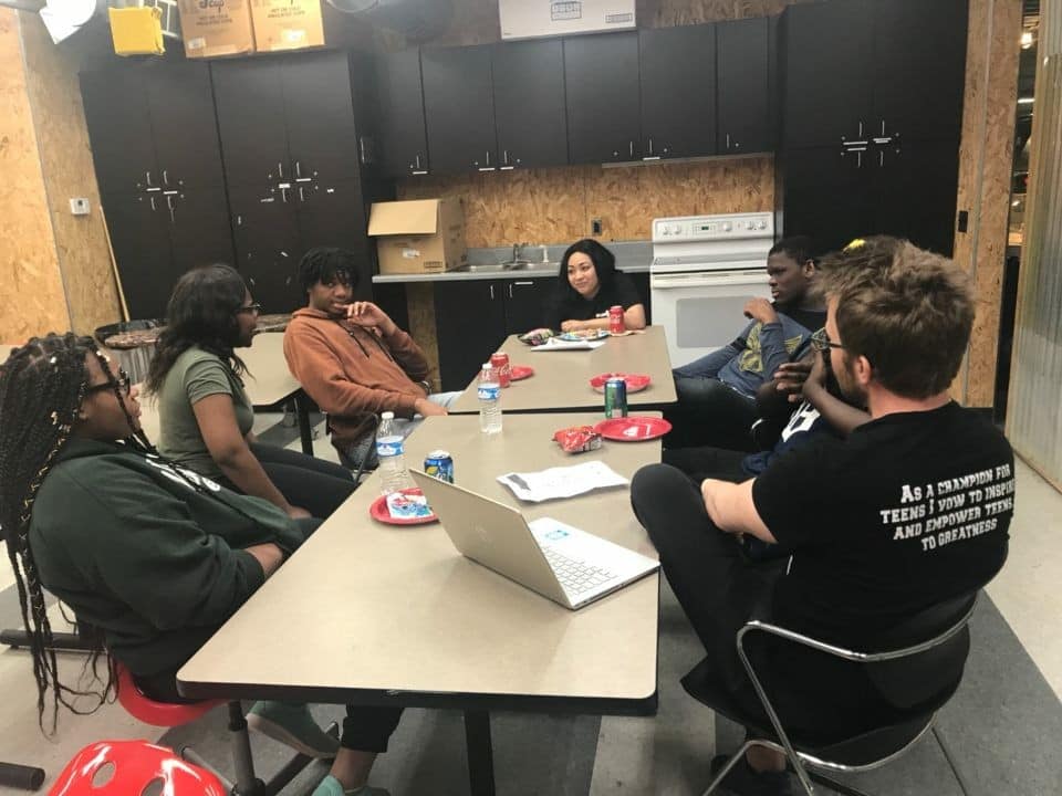 D Smith helping to lead a leadership discussion with Matthew Schmitt (previous CD Fellow) and Teen HYPE Peer Educators_Teen HYPE Lock In (before the pandemic).