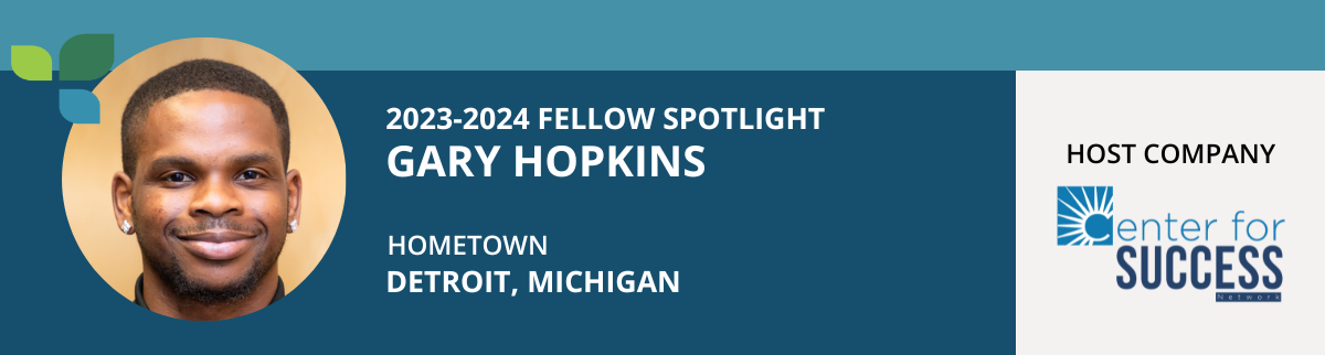 ABOUT: My Name is Gary Hopkins and my hometown is Detroit, Michigan. I went to Michigan State University for a BS in Political Science – Pre Law with a minor in Leadership of Organizations. After graduating from Michigan State, I interned on Capitol Hill in Washington, D.C. with Congresswoman Brenda Lawrence. My experience on Capitol Hill gave me a whole new insight on my career path and was a major factor in my decision to pursue a career in the nonprofit sector. My host company is Center for Success Network where I am a Business Associate.