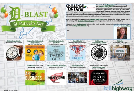 Another contribution to Billhighway is the D-Blast. The D-Blast allows me to use some of my creative design skills I learned in graduate school and link it to my passion for Detroit. Many of my co-workers do not live in the city, but love Detroit. I felt that in my role of a Detroit ambassador, I could bring Detroit into the office. I created a one page document, which points out eight to ten events I believe would be interesting for anyone in our office to attend. I try to incorporate as many free or low cost events as possible. Events range from local wine tastings at Motor City Wine to major exhibitions, like the Detroit Golf Expo. In addition to these events, I also include a short write-up about what the Challenge Detroit Fellows are working on and who is being spotlighted during the week. This document is very well received at work, and it has gained a small following among the fellows. I distribute it in the office, to the Challenge Detroit fellows, and my mentor every Wednesday. I publish each edition on my blog, so anyone else who may be interested can read it.