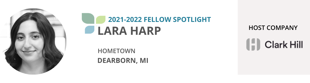 Lara Harp is a 2021-2022 Fellow. Lara grew up in Dearborn, Michigan and attended University of Michigan-Dearborn where she graduated with a Bachelor of Science in Engineering (Bioengineering).