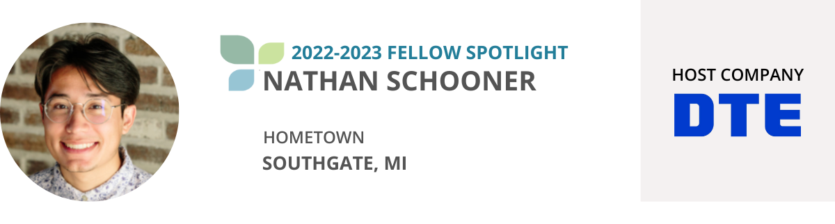 Nathan Schooner is a 2022-2023 Fellow. His host company is DTE where he works on the Workforce Development team. Learn more about Nathan below.