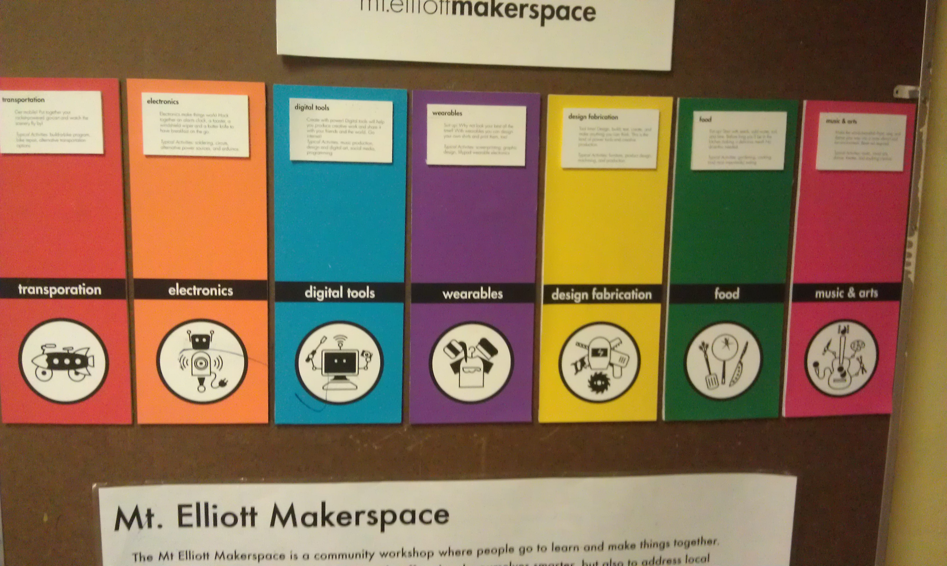Afterward, we traveled to Mt. Elliott Makerspace. This space was not located in Eastern Market, and was actually located in the basement of a church. The space was still pretty big and had seven focuses to be exact (see pic).