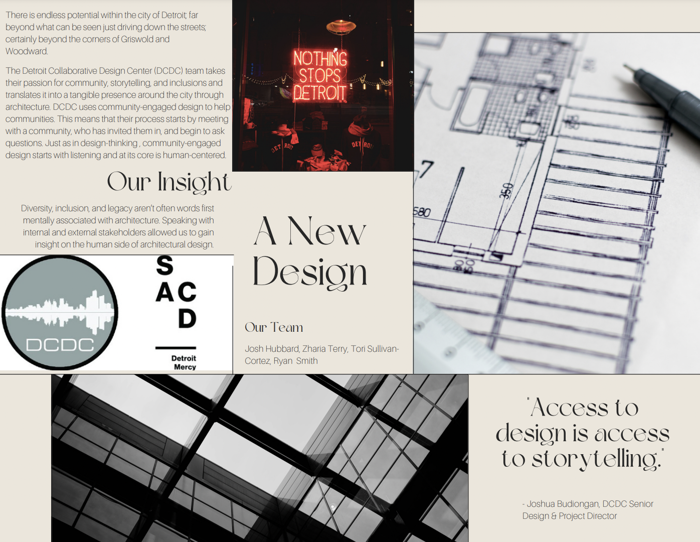 For our culminating and last challenge of the 2021-2022 program year, eight teams of Fellows selected nonprofits to work with that they were excited to support. Leveraging skills practiced and developed over the course of the fellowship, they co-designed these project collaborations with their partner organization. Fellows Ryan Smith, Josh Hubbard, Tori Sullivan-Cortez, and Zharia Terry partnered with nonprofit The Detroit Collaborative Design Center with Julia Kowalski and Ceara O’Leary. Learn more about the collaboration below.