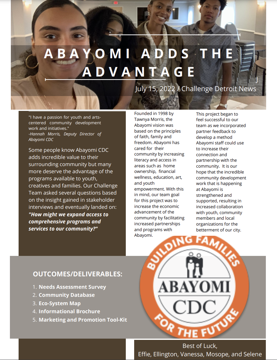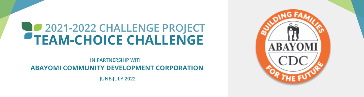 For our culminating and last challenge of the 2021-2022 program year, eight teams of Fellows selected nonprofits to work with that they were excited to support. Leveraging skills practiced and developed over the course of the fellowship, they co-designed these project collaborations with their partner organization. Fellows Selene Clark, Mosope Ismail, Vanessa Vigier, Ellington Smith, and Effie Alofoje-Carr partnered with nonprofit Abayomi CDC with Hannah Morris. Learn more about the collaboration below.