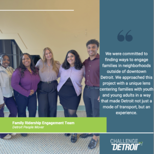 As the Family Ridership Team, we were intentional about working together to complement the amazing work that the Detroit People Mover has already done so far. We were committed to finding ways to engage families in neighborhoods outside of downtown Detroit. We approached this project with a unique lens centering families with youth and young adults in a way that made Detroit not just a mode of transport, but an experience. How might we encourage families in Detroit neighborhoods to become new riders of and champions for the People Mover? That question shaped our deliverables, from youth-specific activities like an “I Spy” challenge to incentives that encouraged families to return. “For adults, the Detroit People Mover gets you to your destination. But, for kids, the Detroit People Mover is the destination,” Detroit residents Seth & Jewel shared with us. That’s exactly what we set out to achieve – a creative, innovative project that turns the Detroit People Mover into a space of discovery, learning, and fun for everyone.
