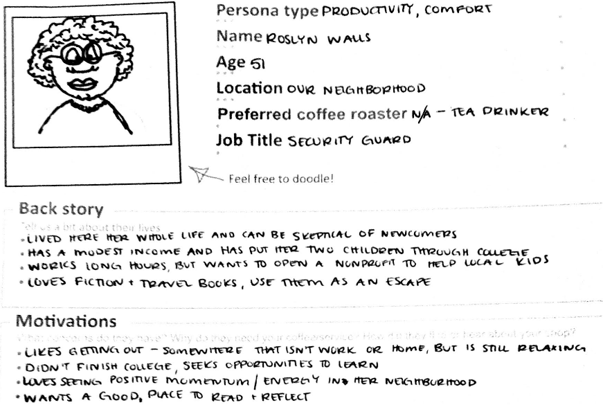 However, the month of July brought a stroke of luck in that we were allowed to use our Challenge Detroit Fridays for a passion project of our choice. Naturally, Alexandra and I used the time to beef up our business plan with some new market research that plays into human-centered design. Roslyn (+9 other personas) and her interests, backstory, taste profile, and ideal coffee shop experience were the culmination of 169 survey results from coffee, tea, and booze drinkers across the nation, and just one component of a month-long dive into what Detroiters want out of a coffee shop socially and emotionally.