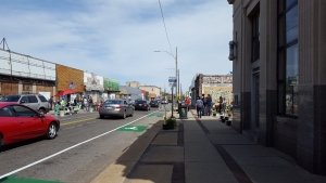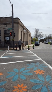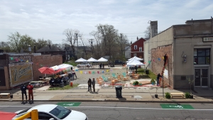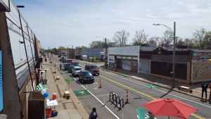 Our process was community-driven from the start. Home grown, as it were. We asked local residents what kind of activities they’d like to see happen in the vacant lot we wanted to activate. We heard things like resource tents, hula-hooping, kids activities, local food options. We worked hard to make these things a reality. The rest of the streetscape design was crafted through many previous community meetings that happened to inform a larger planning process for this area. We installed things like bike lanes, crosswalks, a parklet, parking lines, and a temporary façade installation.