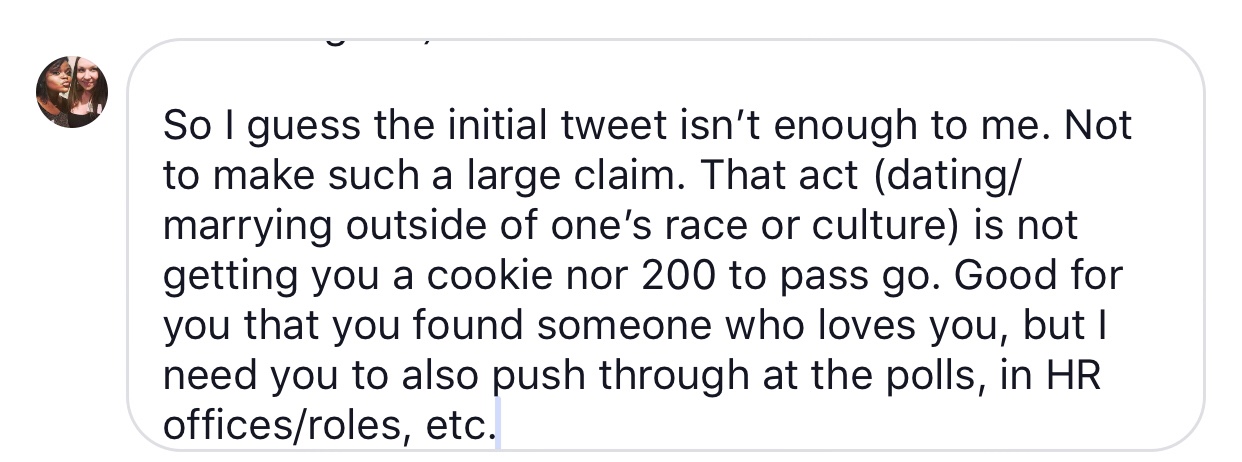 Now, 2018Detroit? Living in that 2kstudioloftDetroit? There’s something about a city on the rise (per headlines) which seems to attract people who believe they’re making a statement by breathing a particular way. Much like my thoughts on recent transplants who were afraid of Detroit 5 years ago– do not effectively tokenize your partners. You cannot offset your bias just because of a social circle. If your partner runs the risk of having their “Get Out” moment when they join your family during major events? You really aren’t as evolved as you thought.