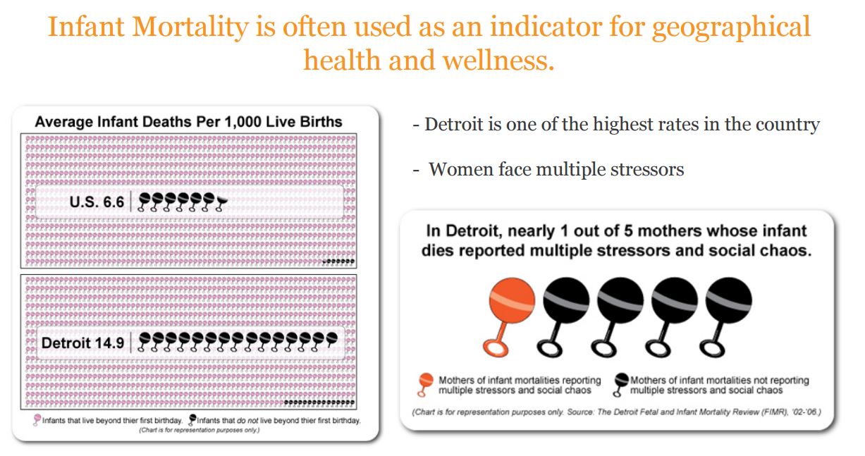 For our last challenge, we worked with the Health Disparities Coalition, which is a group of health systems, medical schools, and one non-profit, to tackle different health disparities in Detroit. My team worked on Detroit’s high infant mortality rate, and try to design a solution that can help bring it down. For those unaware, infant mortality is defined as any infant deaths within the first year of their life. Here is a graphic that explains the current state in Detroit.